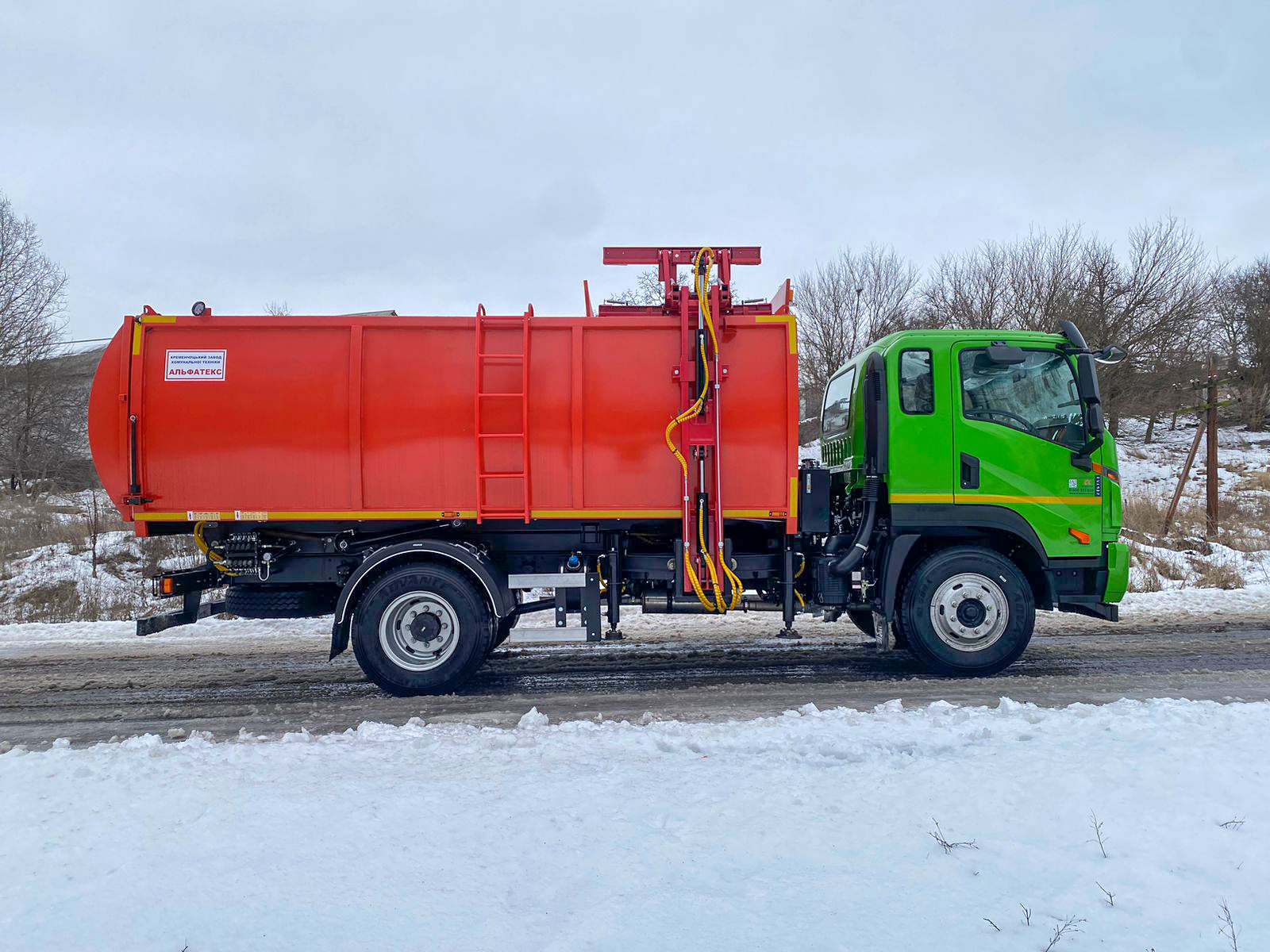 Об'єм кузова сміттєвоза становить 15 куб.м., а вантажопідйомність бокового маніпулятора сягає 700 кг.
