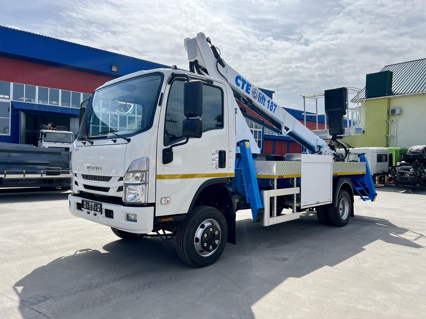 Автовишка CTE B-LIFT 187 в стандартній комплектації обладнана люлькою з електроізоляцією, що дозволяє оператору проводити роботи на лініях електропередачі й зв’язку під напругою до 1000 В без відключення електроенергії.