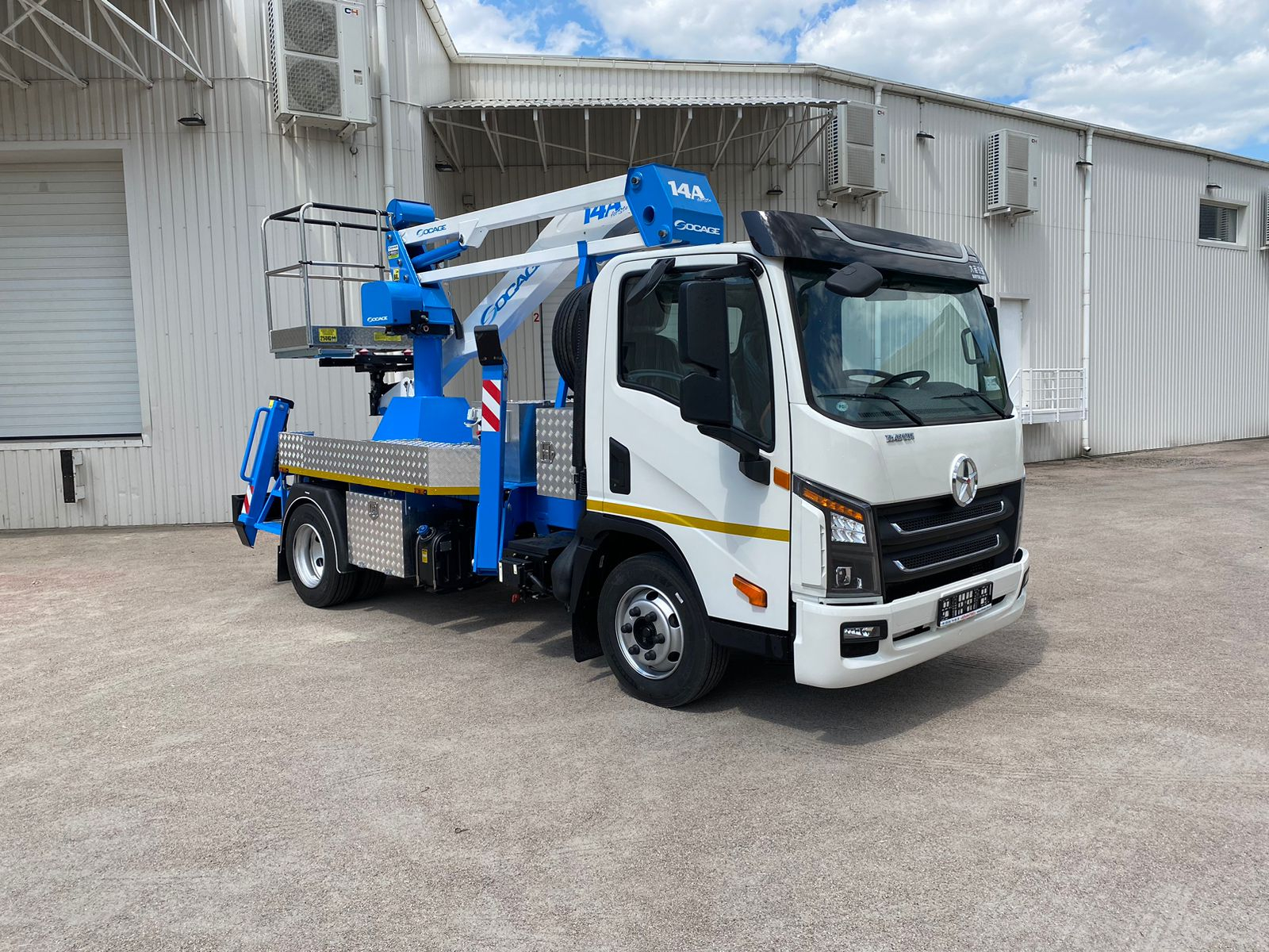 SOCAGE A314 на шасі DAYUN CGC1060 оснащений ізоляційною люлькою, що робить його ідеальним для роботи на лініях електропередачі та зв'язку під напругою до 1000 В.