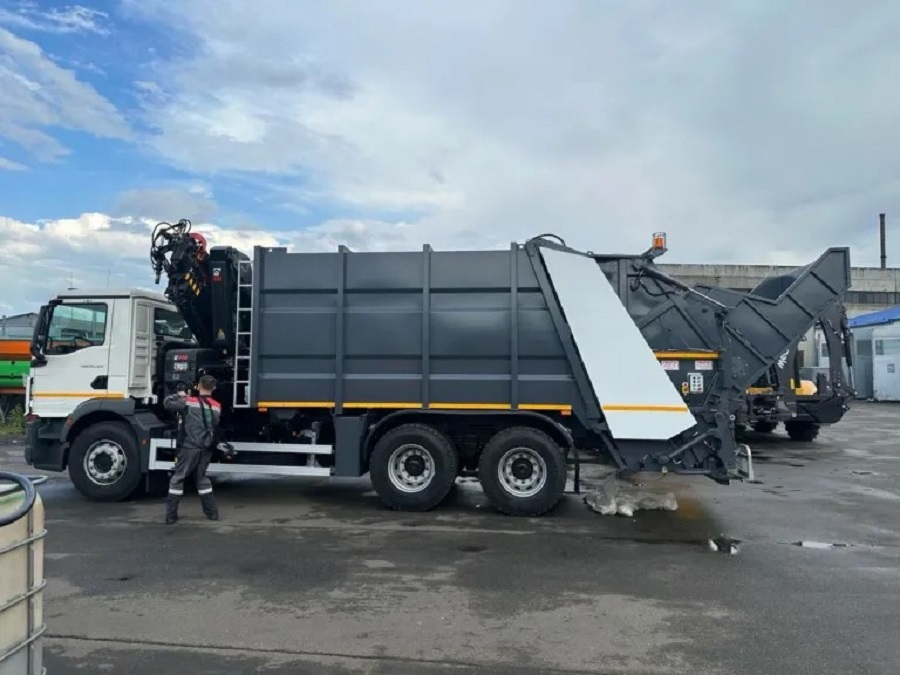 Новинка оснащена бункером внутрішнім об’ємом 18 кубометрів. Між надбудовою та кабіною встановлений кран-маніпулятор HIAB X-HIDUO 228 для роботи зі сміттєвими контейнерами типу «дзвіночок» місткістю 5,5 м куб.